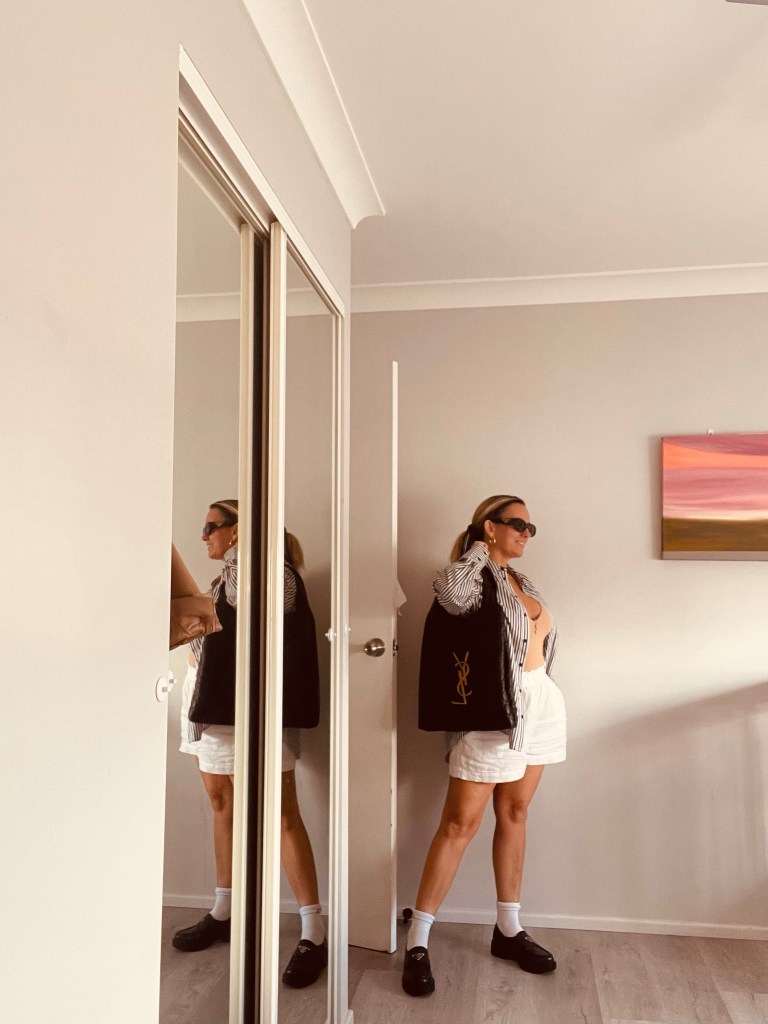 Look 2: White Linen Shorts, Prada Loafers, and Striped Shirt